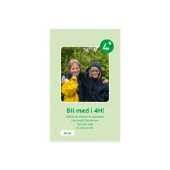 4H Vervekort med teksten "Bli med i 4H! Utforsk en verden av aktiviteter. Vær med å bestemme. Lær noe nytt. Få nye venner." Mer informasjon på baksiden. Perfekt til vervearbeid! NB! Maks 100 stk per ordre.