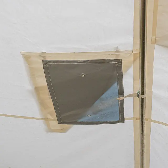 Teltet har fire vinduer og inngang i begge ender. Inngangene kan rulles opp eller tas av. Sideveggene kan delvis rulles opp eller tas av. Luke for skorstein. Vaskbar og flammesikker polyesterduk. Kraftig stangsett i aluminium (40x2 mm aluminiumlegering). Hurtigkoplinger i støpt aluminium.